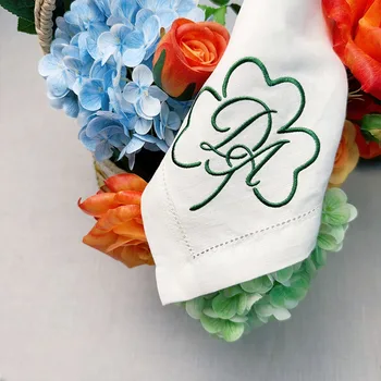 LY Dinner Restaurant Hemstitch Handkerchief Cloth Embroider Monogram White Linen Fabric Table Napkin