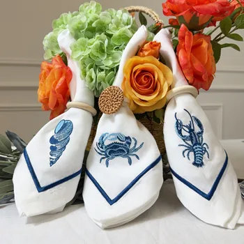 Blue and White Porcelain Customized Wholesale Hemstitch Embroidered Linen Napkin With Logo for Wedding